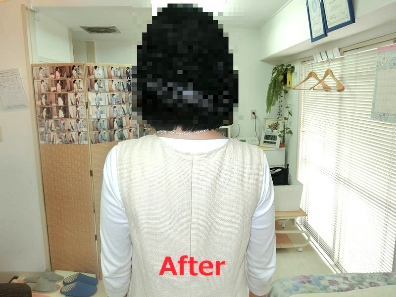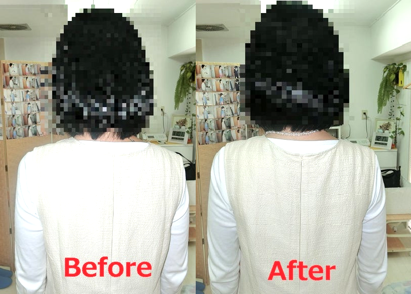 長年悩まれていた右肩の下がりも、施術後には見事に改善。左右の肩の高さがほぼ揃い、全身のバランスが取れていました。