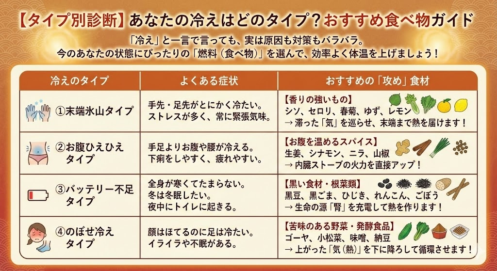 「冷え」と一言で言っても、実は原因も対策もバラバラ。今のあなたの状態にぴったりの「燃料(食べ物)」を選んで、効率よく体温を上げましょう!