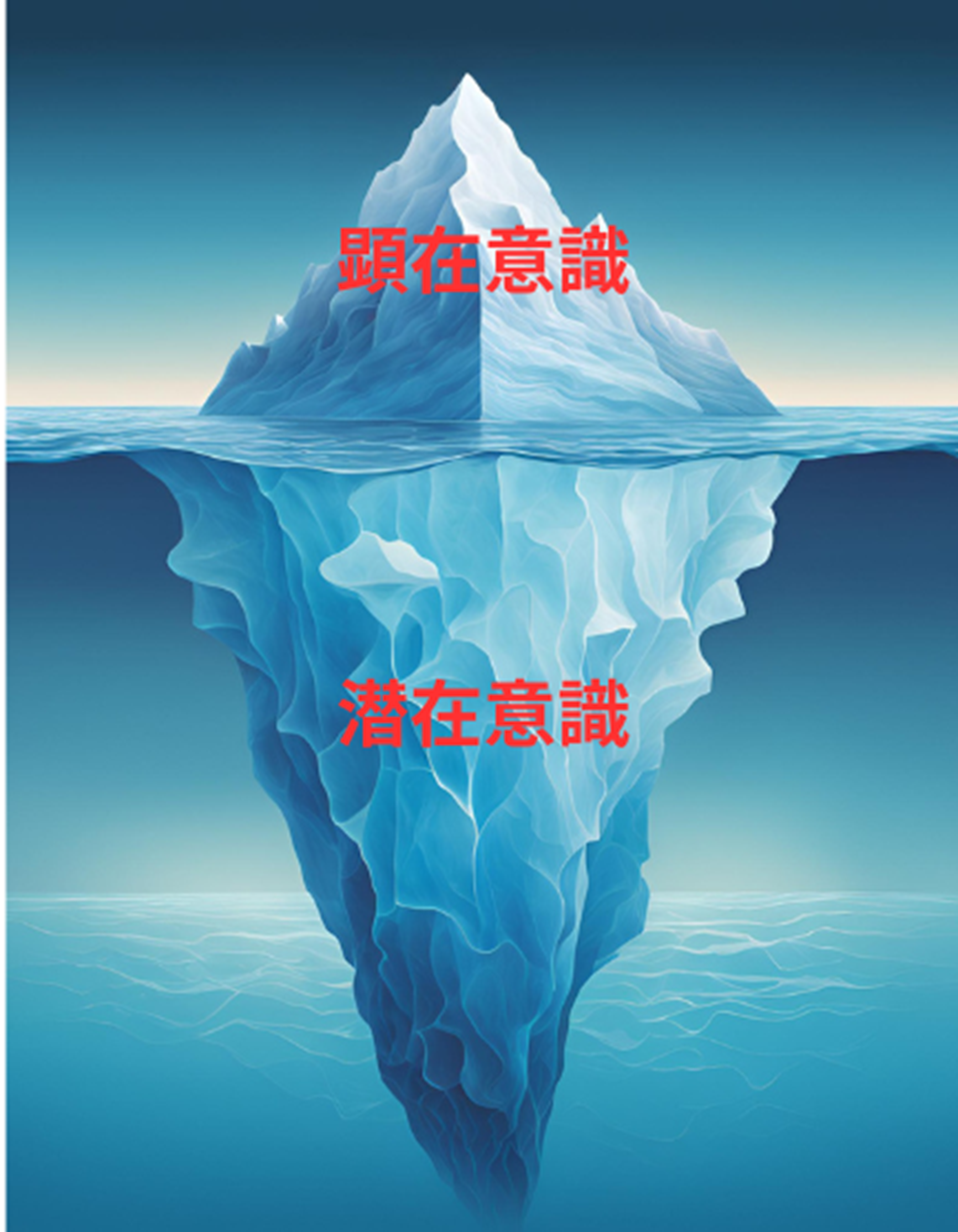氷山にたとえると、海面から出ている小さな部分が顕在意識、水面下に広がる巨大な部分が潜在意識です。