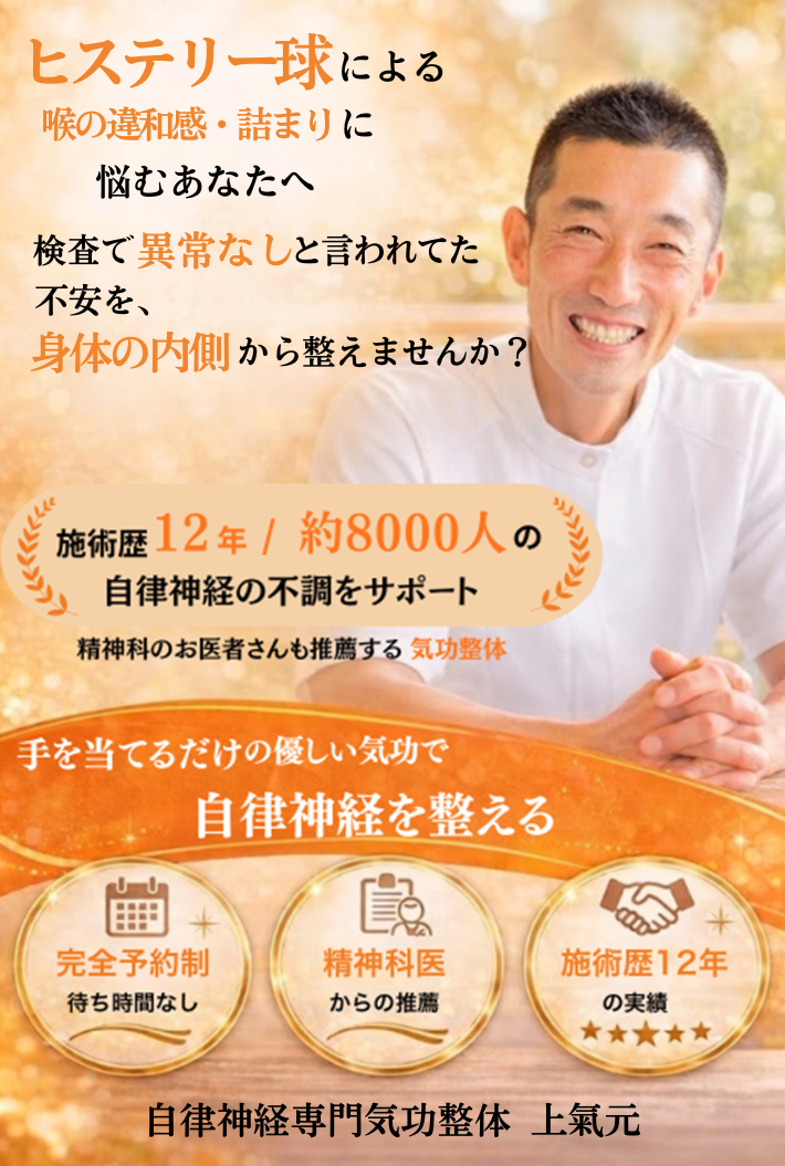 精神科の医師からも推薦をいただいている当院の気功整体は、喉そのものではなく、自律神経やホルモンバランスの乱れに直接アプローチします。